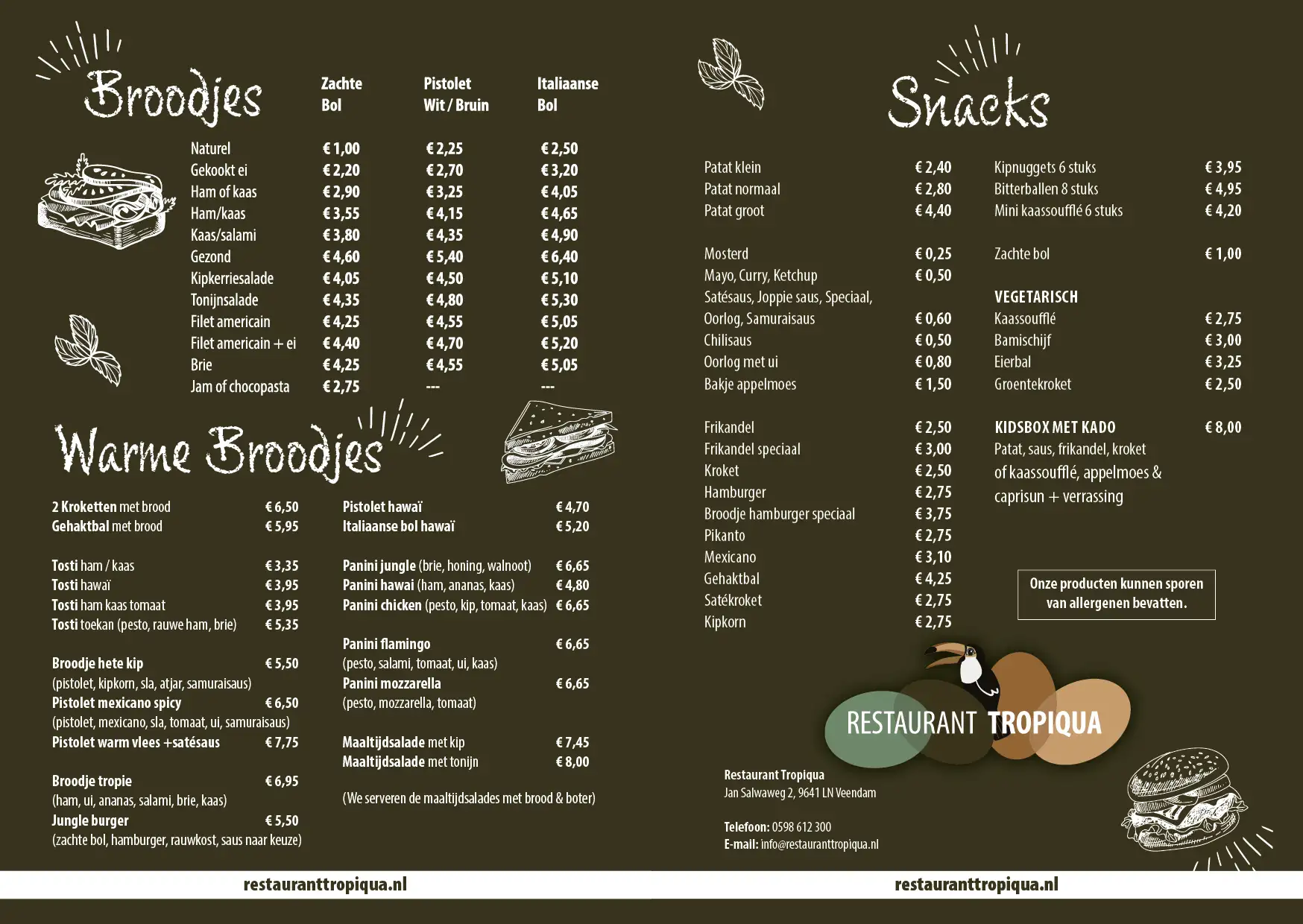 Of u nu zin hebt in een lichte snack of een stevige maaltijd, Restaurant Tropiqua heeft voor ieder wat wils. Van verse warme broodjes tot smakelijke snacks, er is altijd iets lekkers om van te genieten tijdens uw bezoek. Dus neem een pauze, verwen uzelf met een heerlijke koffie en geniet van de verrukkelijke broodjes en snacks die Restaurant Tropiqua te bieden heeft.